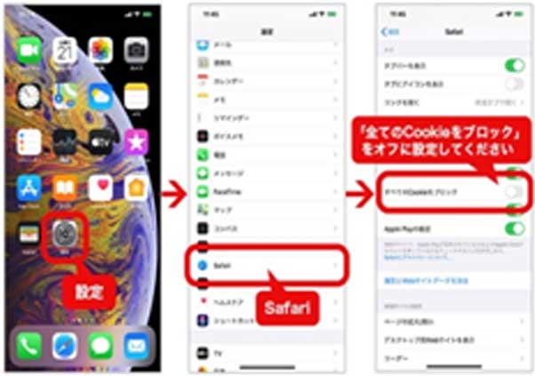 下記画面を参考にブラウザ(Safari)の設定をご確認下さい。