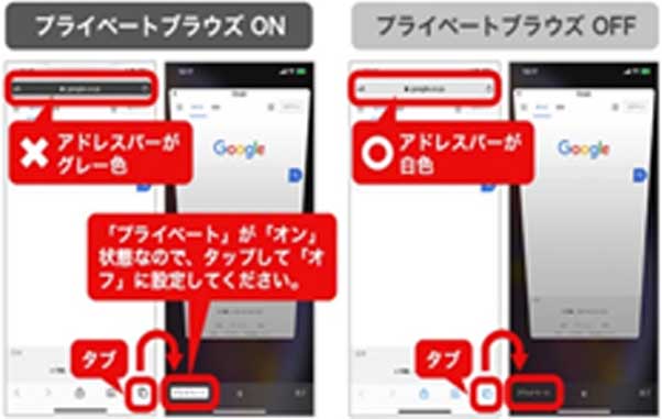 また、「プライベートブラウズ」が「オン」になっていると、Cookieが無効となり、前回の登録情報が表示されません。プライベートブラウズの設定をご確認ください。